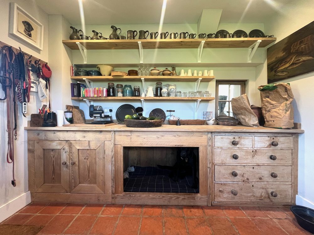 This addition was created as a porch to the side of the house, which has become the everyday front door and has multiple uses - a home to Jambo the dog, a boot room, pantry and storage area. The bespoke carpentry was created entirely from old pallettes, and the reclaimed quarry tiles makes it feel like its as old as the rest of the house.