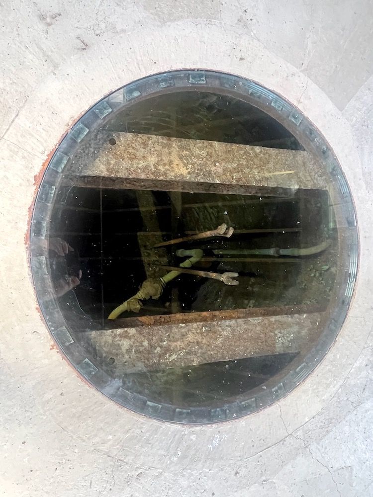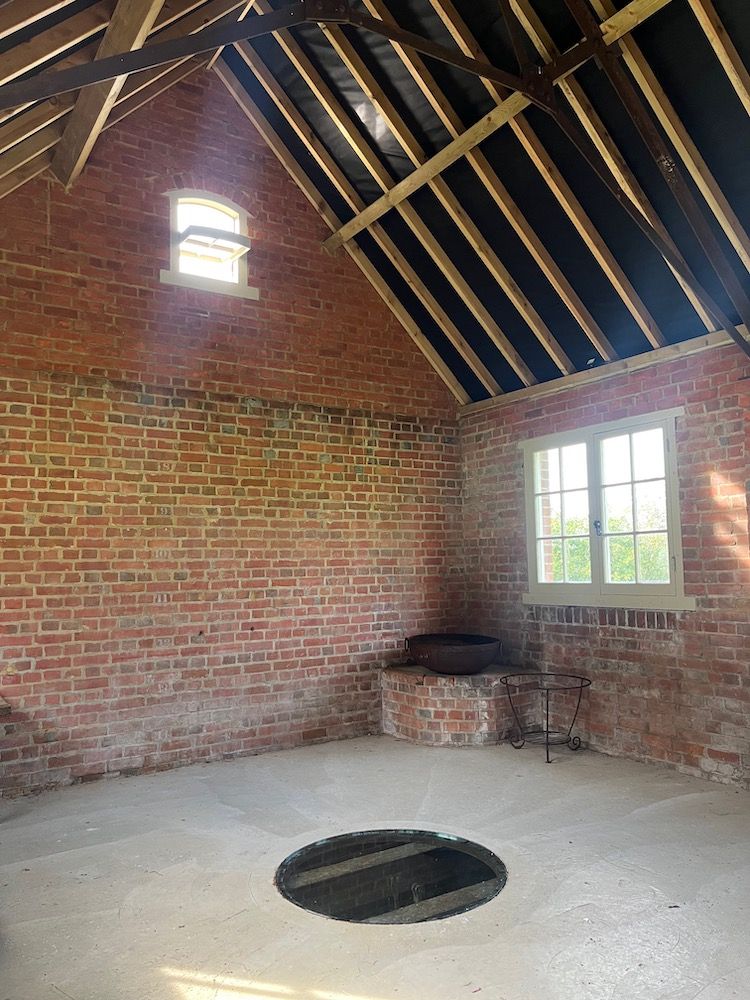 This beautiful, boxy little building is built from red brick with clay peg tiles. One of the most significant elements of the restoration was the work on the interior of the house. The wrought iron metalwork was created by local metalsmith Richard Weaver, who Al contracted to join the project. The metal well cover on the floor was also constructed by Weaver, and it became a beautiful feature of the house.